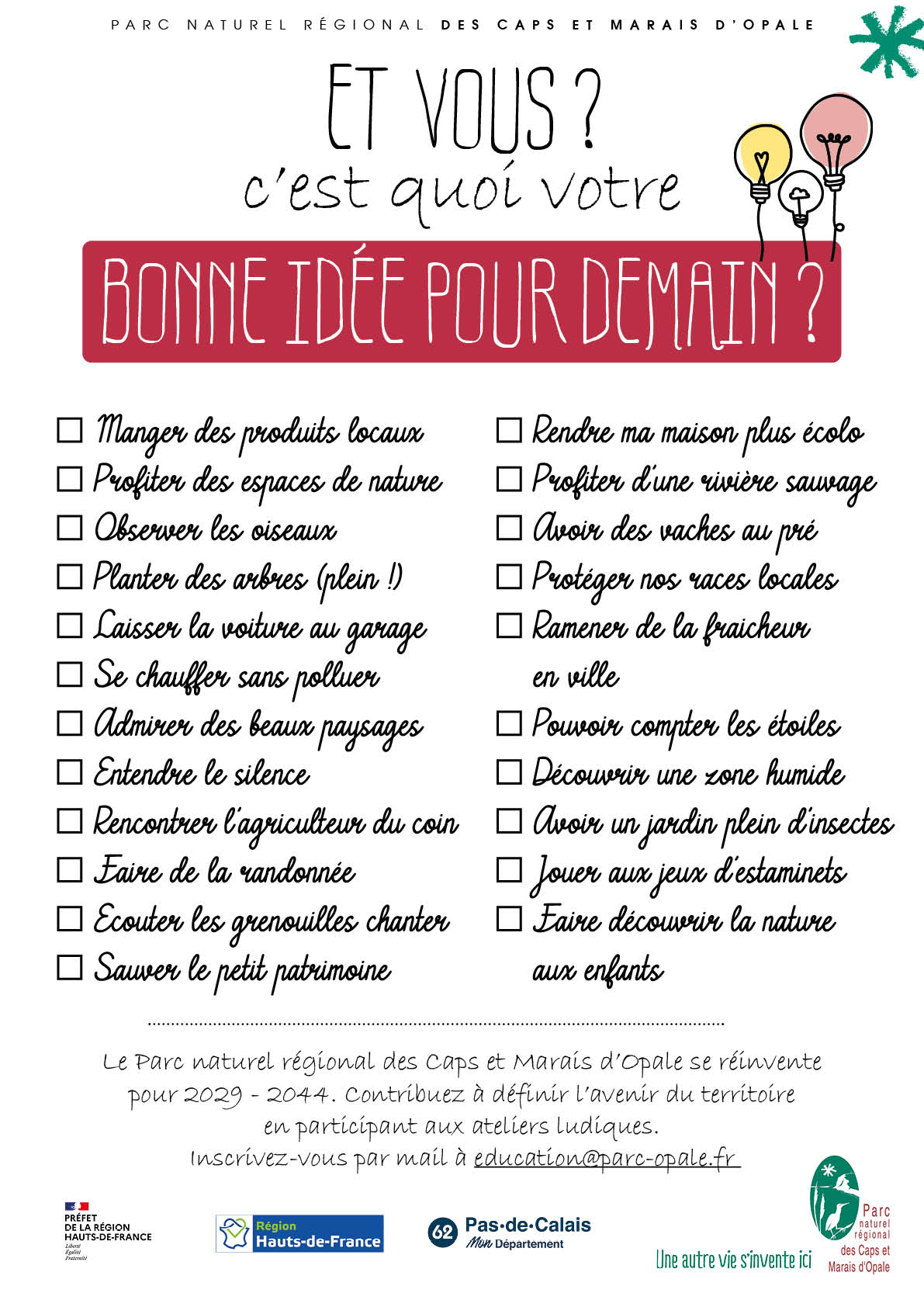 Ces questions, elles seront posées aux habitants des Caps et Marais d'Opale au travers d'ateliers de concertation. Nous vous proposons d'intégrer un groupe d'habitants (30 max.) qui sera invité à des ateliers pratiques et ludiques, des conférences pour nous éclairer sur les enjeux qui nous attendent et des rencontres avec les acteurs du territoires : agriculteurs, artisans, entreprises... Ces ateliers seront à la fois des espaces d'expression mais aussi des outils pour mieux comprendre les enjeux du territoire. Ce sera l'occasion d'évoquer de façon ludique et concrète l'avenir du territoire et de ceux qui y habitent.
