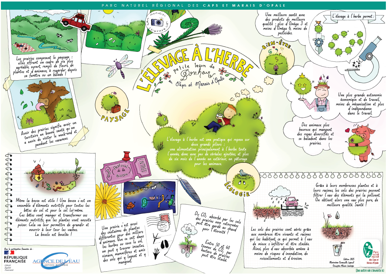 Saviez-vous que l'élevage à l'herbe de vaches nous permet d'avoir de beaux paysages sous nos fenêtres ? Et est-ce que vous saviez que cela permet aussi de préserver la biodiversité ? Il est temps de le découvrir grâce à un poster réalisé par le Parc naturel régional et les talents de ses agents ! Découvrez tous les enjeux écologiques, économiques et paysagers de laisser ses vaches aller brouter !