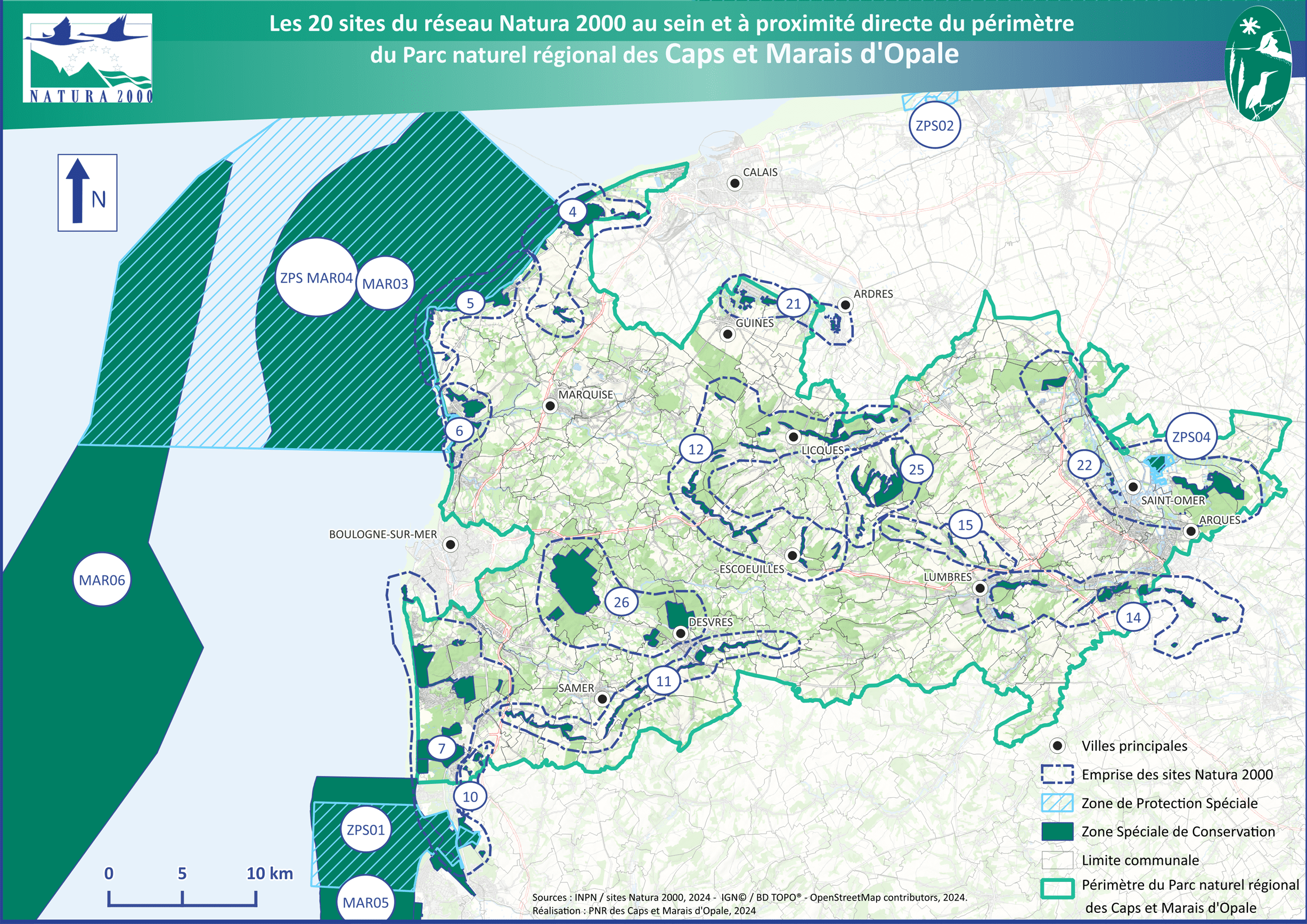Natura 2000 est un label européen qui reconnait les sites naturels pour leur faune et leur flore remarquables. Sur le territoire du Parc naturel régional des Caps et Marais d'Opale, 8 079 hectares (soit 14 sites) sont classés Natura 2000 dont près de 4 700 hectares d'habitat classés au titre de la directive Habitats-Faune-Flore dit d'intérêt communautaire. Sur ces sites, une règlementation particulière est en vigueur, notamment pour ce qui est des activités aériennes et de la pratique des sports de plein air.